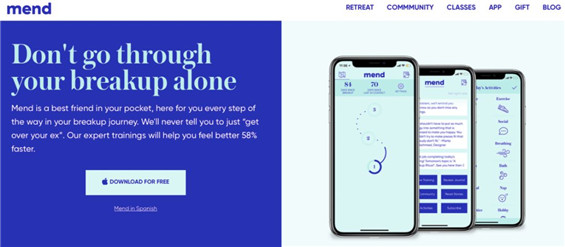 Mend也是美國一家一站式分手療愈創(chuàng)業(yè)公司,提供從在線咨詢指導(dǎo)到分手療愈旅行的服務(wù)。