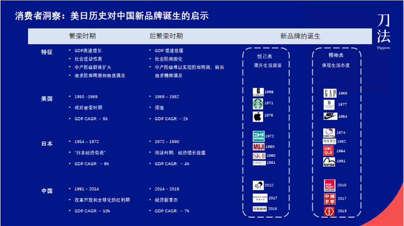 再看日本。1954-1972年間,日本創造了戰后經濟快速復蘇的奇跡,隨之而來的石油危機又讓日本放緩步伐,但也在之后的十年內迎來了本土品牌的井噴。
