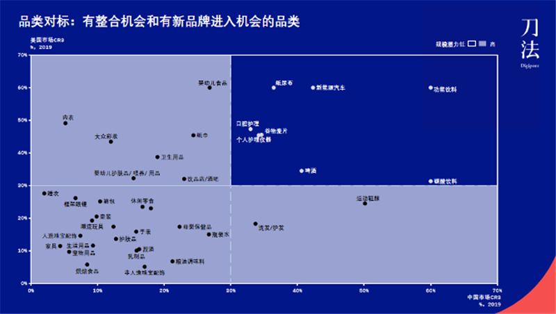 右下角的象限表示,這個行業美國市場的整合度沒那么高,但相對而言中國市場整合度較高,我們覺得會有一些中國本土的新品牌重新進入這個市場的機會。