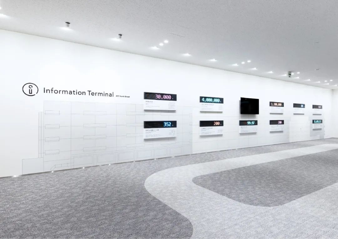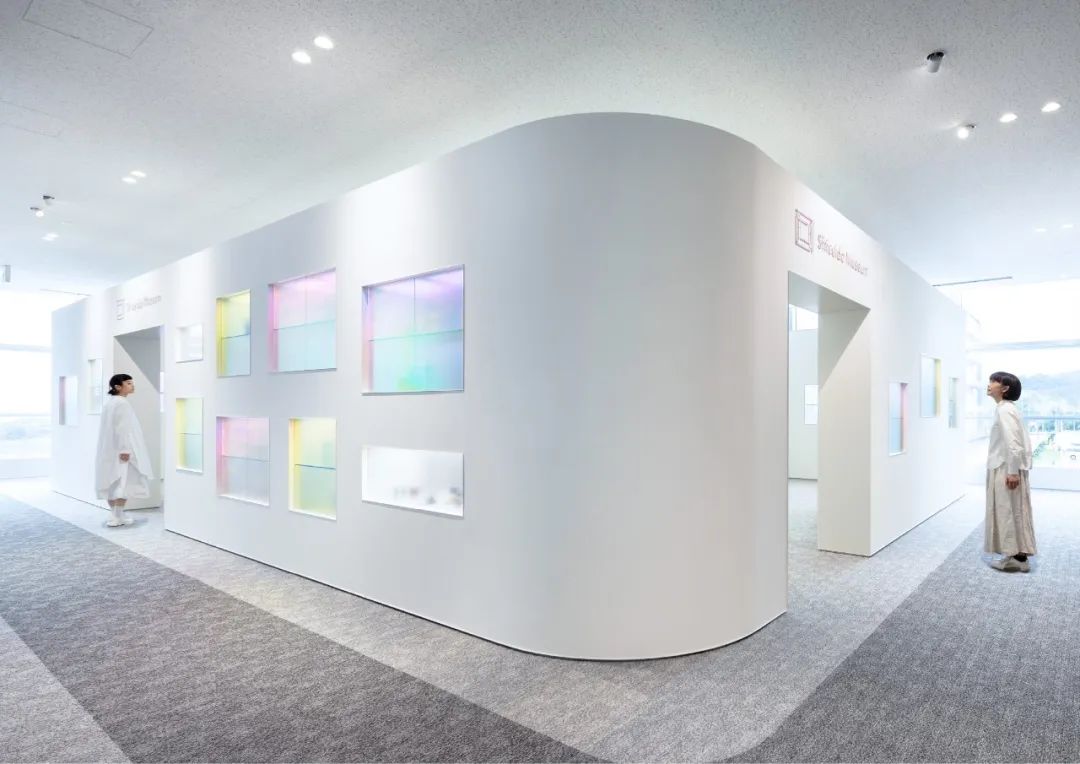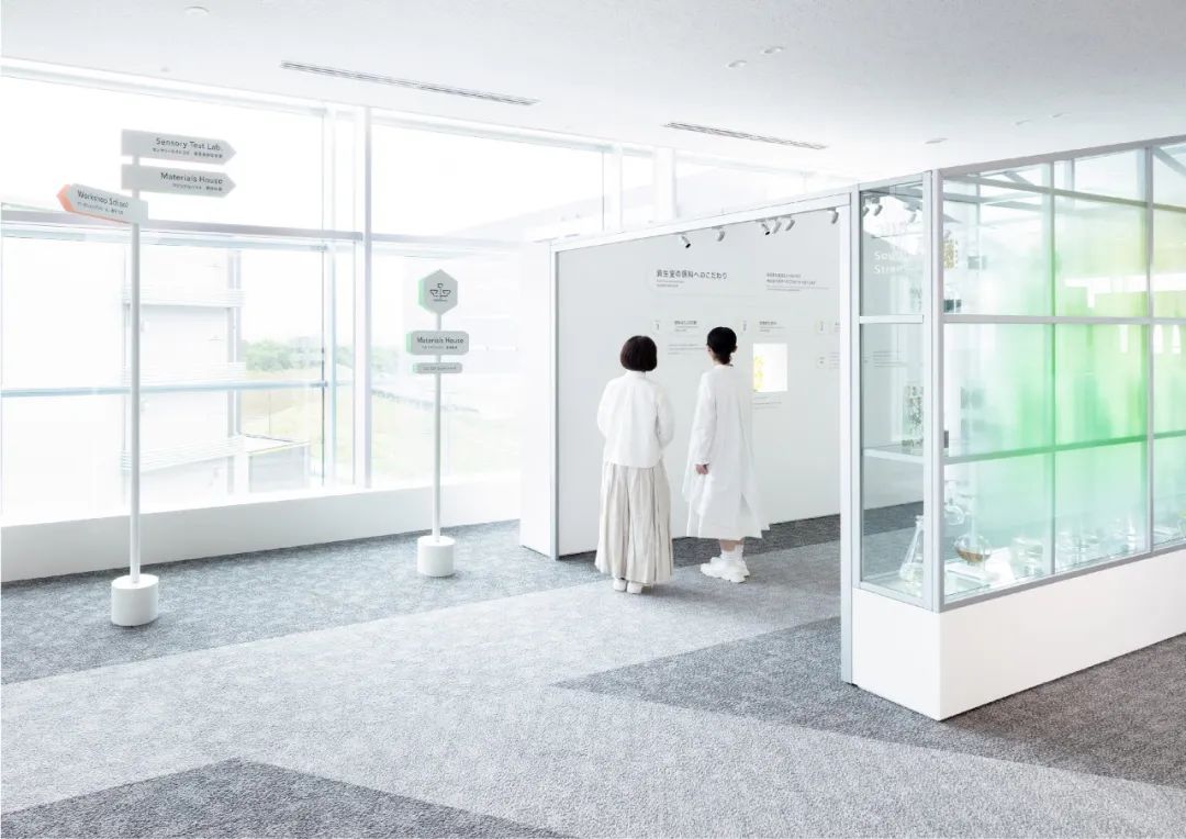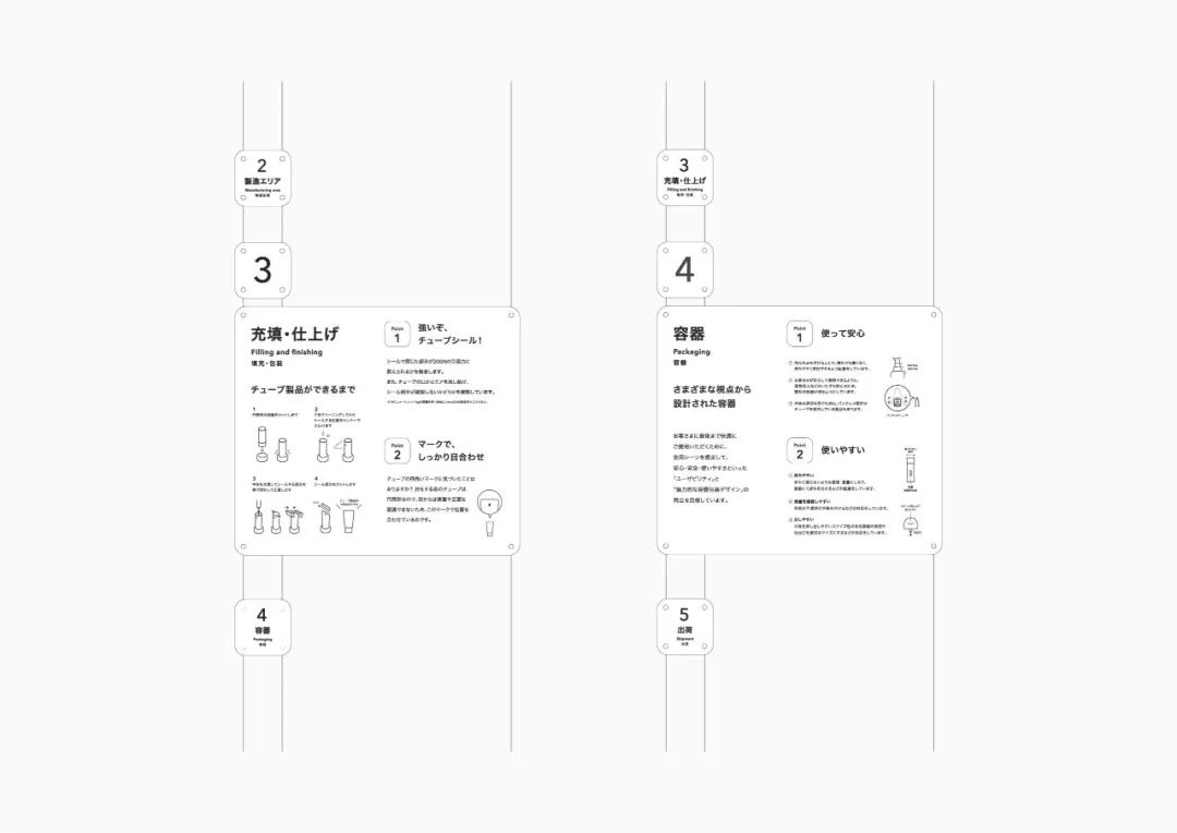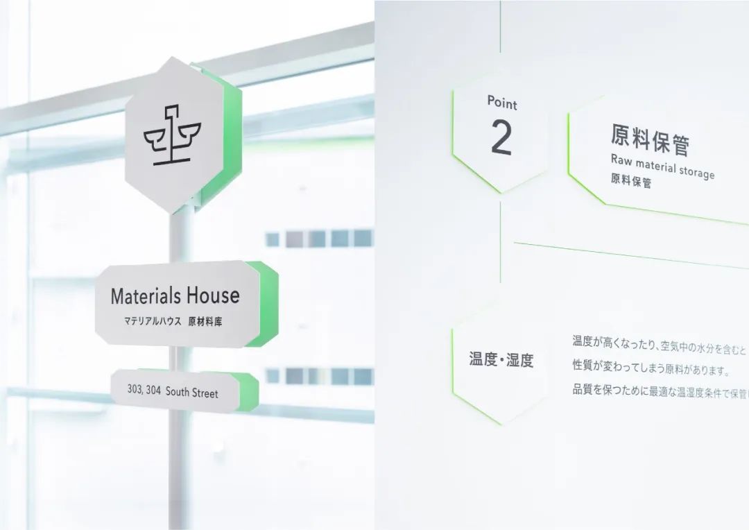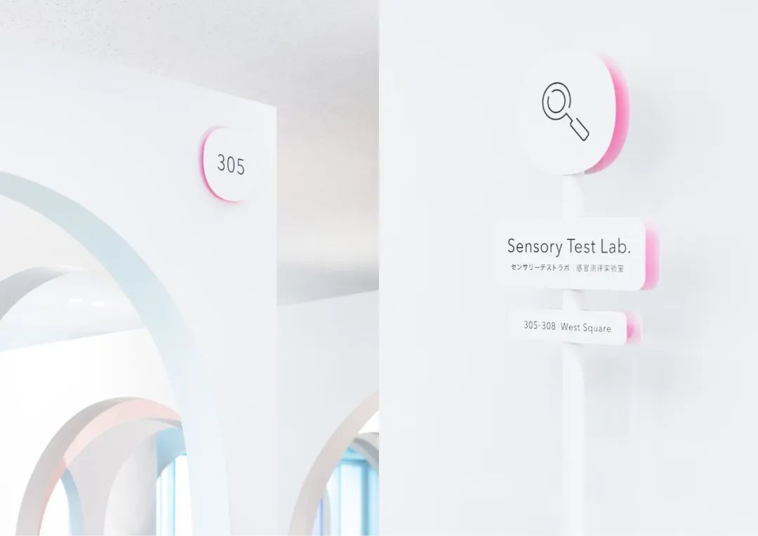 還設置了用于可視化各區域特征的圖標和顏色。區域顏色通過在簽名背面貼上切割片,將其顏色反射到白色的墻壁上來表現。在白色的空間里有節奏地配置輕快的顏色,展現了旅行的期待感和樂趣,以將參觀工廠的體驗比作“旅行”的簽名為目標。