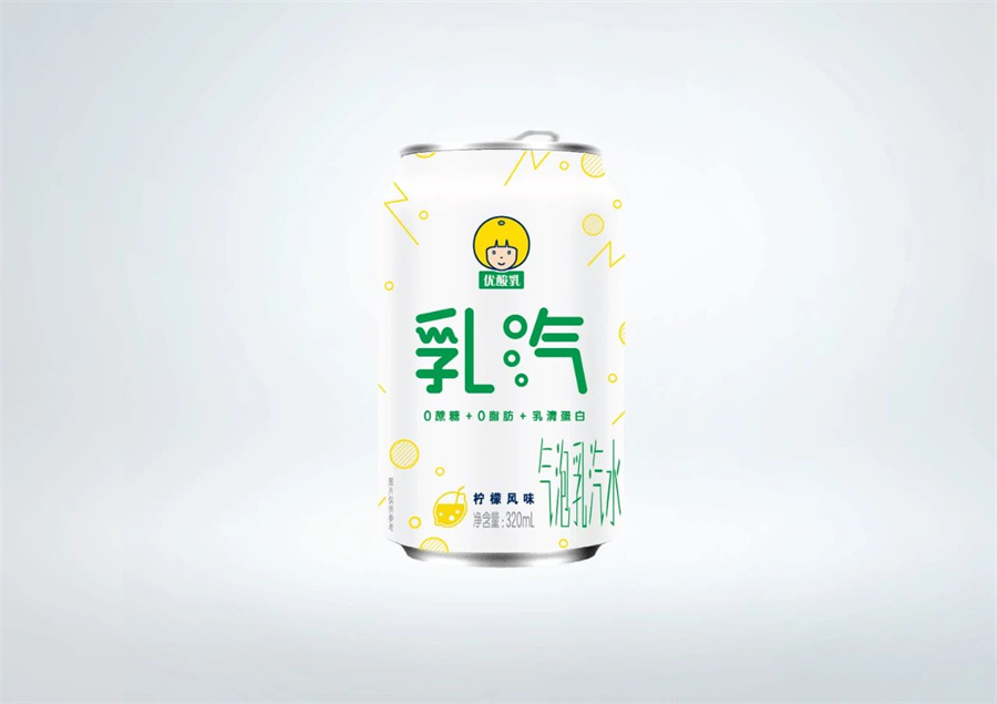 伊利優酸乳夏季推出的新品“乳汽”鋁罐包裝設計,牛乳+氣泡,在市場上已常見的“0蔗糖、0脂肪”特點之上,添加“乳清蛋白”,打造全新的“氣泡乳”新品類。