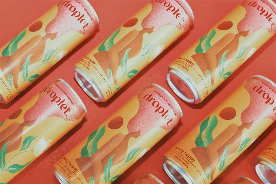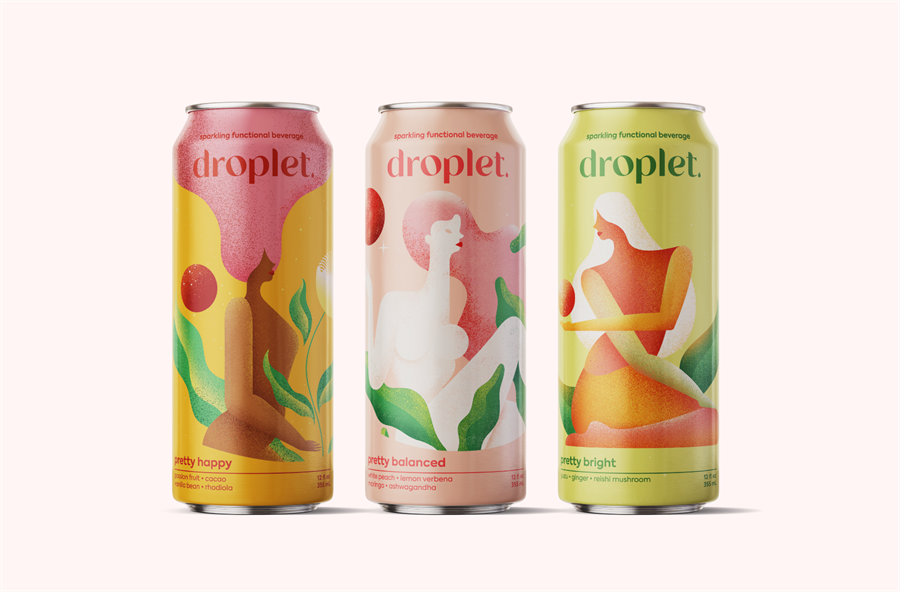 DROPLET SPARKLING ADAPTOGEN DRINKS 植物蘇打鋁罐飲料包裝設計由全女性設計師和食品科學家團隊開發設計,多種功能植物口味和氣泡水結合,是針對女性的科學健康植物蘇打飲料。