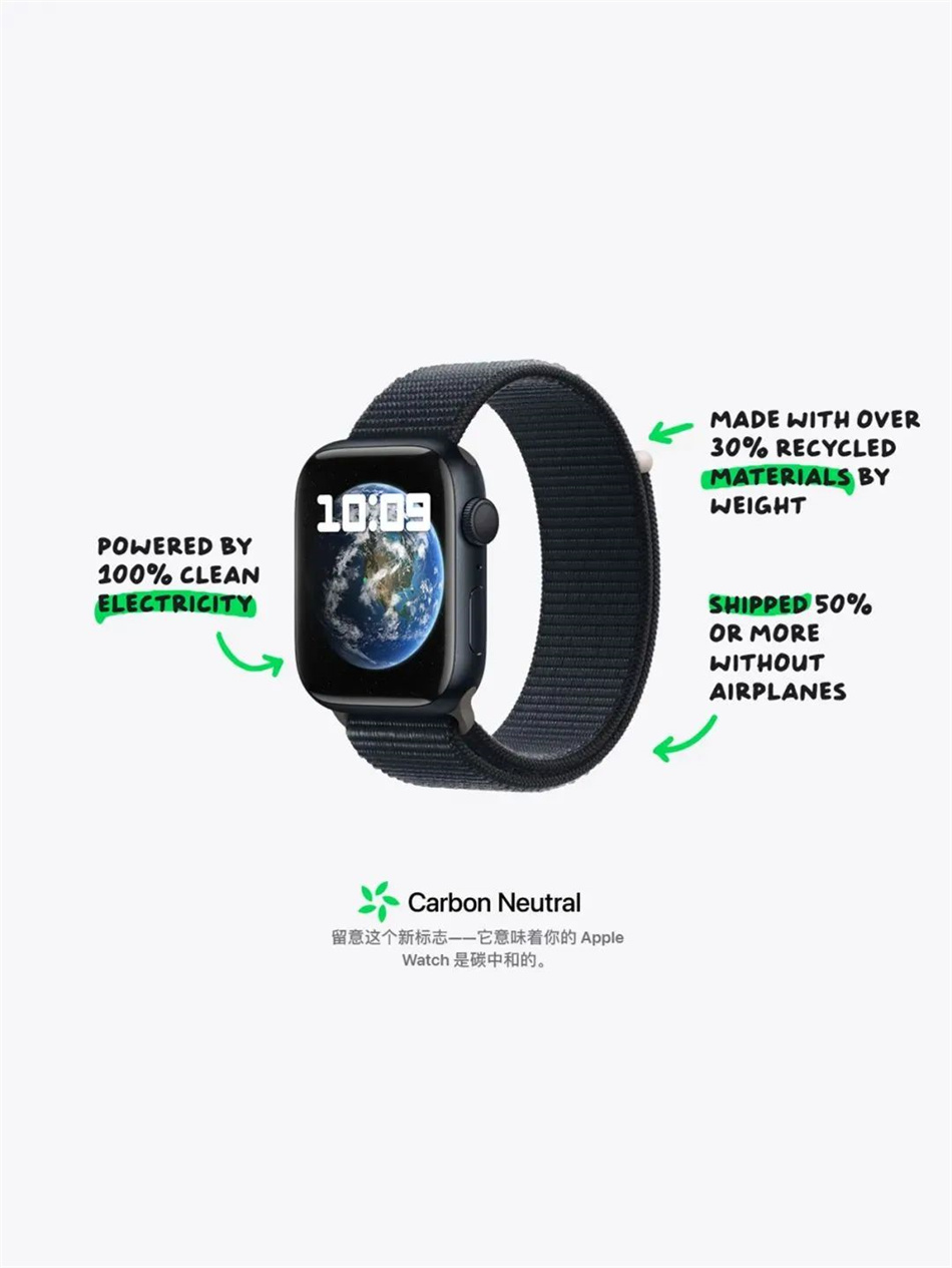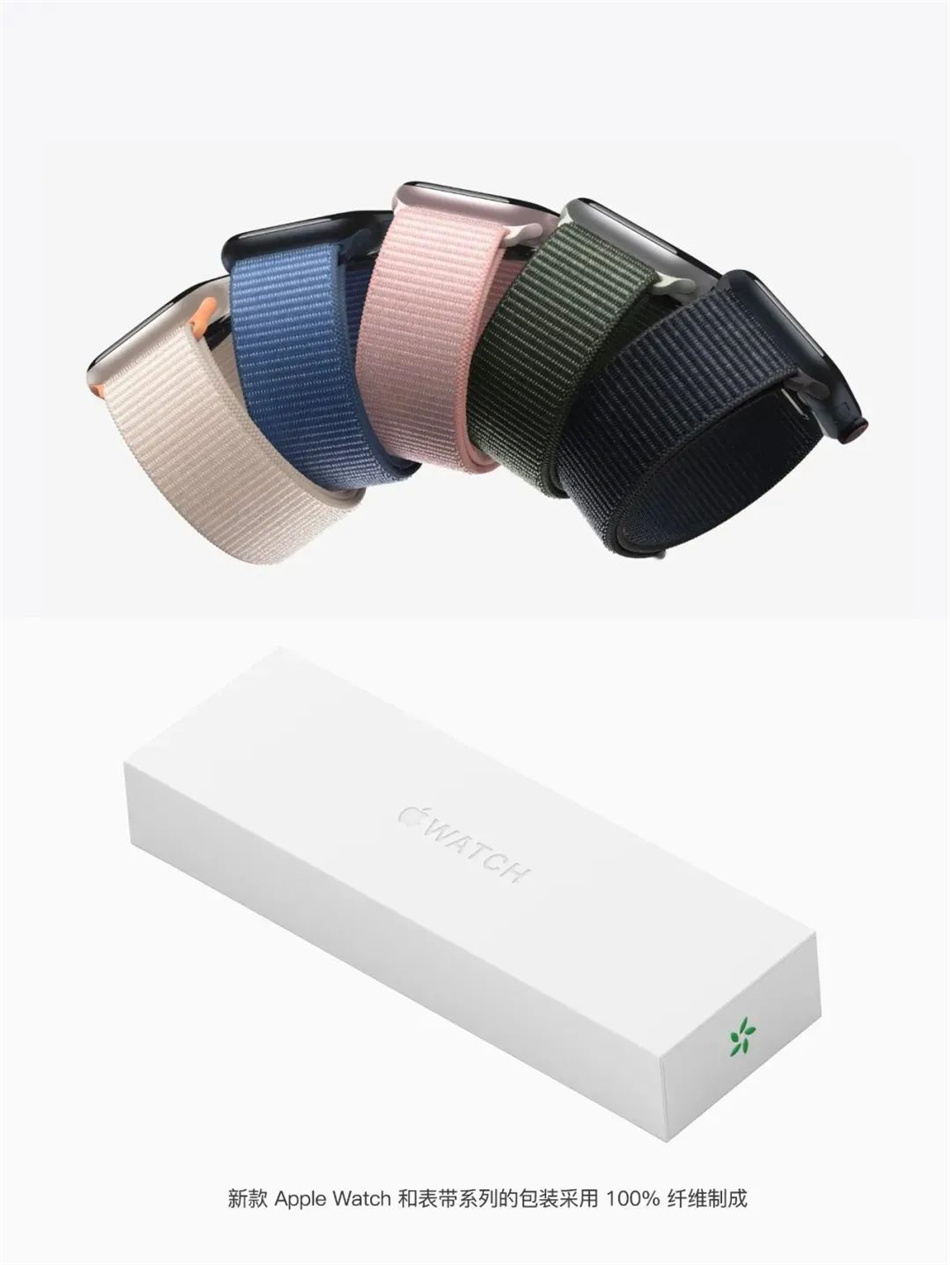 為了達到 "Apple 2030" 碳中和目標,蘋果不再使用皮革,并宣布為新款 Apple Watch系列推出首款完全基于纖維的包裝設計,同時繼續擴大回收材料的使用。