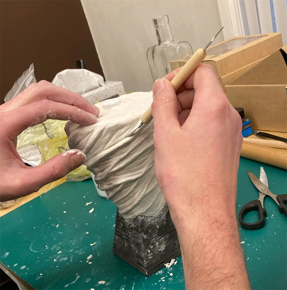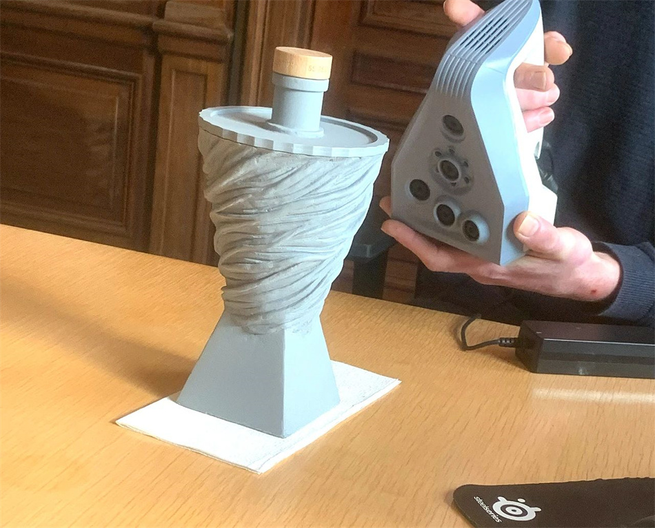 我們用木車床做了一個精密的木錐體。一個由泡沫和激光切割的頂部組成的切片和磨砂金字塔構成了我們的基地。把零件放在一起后,我們用粘土雕刻了一個角狀的紋理。完成后,3D掃描儀將我們的瓶子捕獲到一個點云中。與技術圖紙一起,將捕獲的文件建模為可操作的文件。