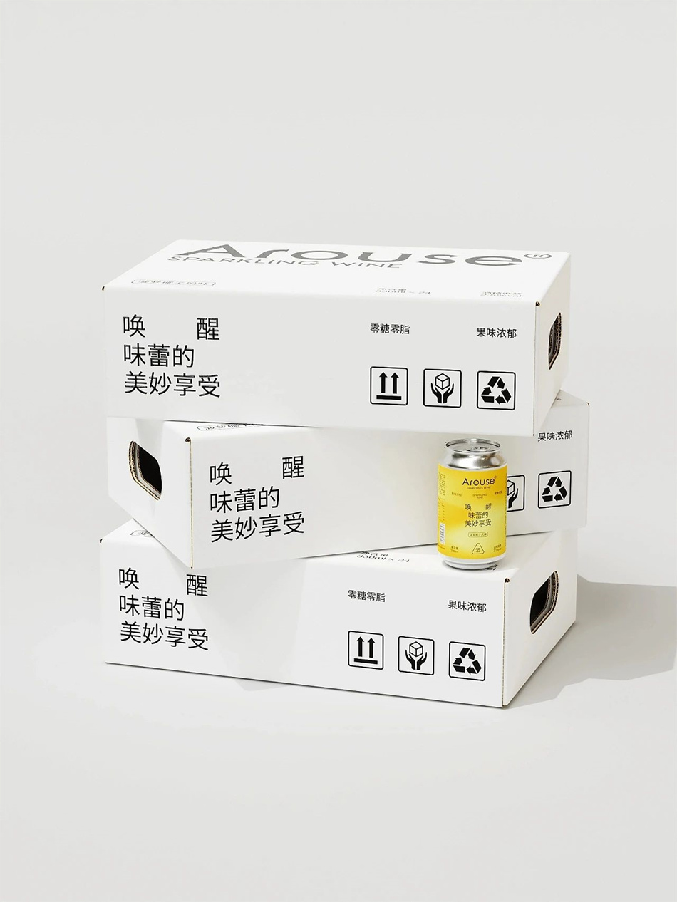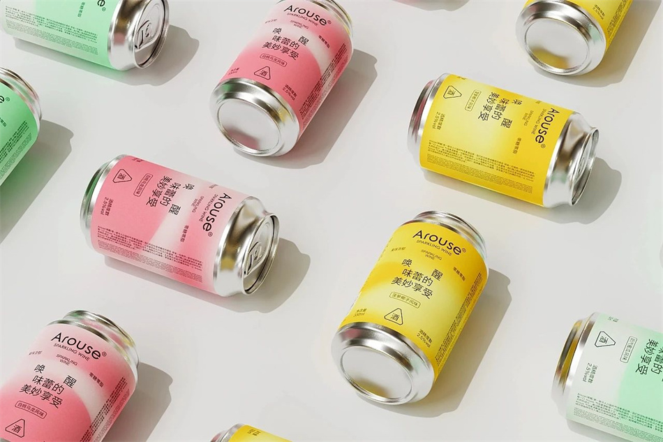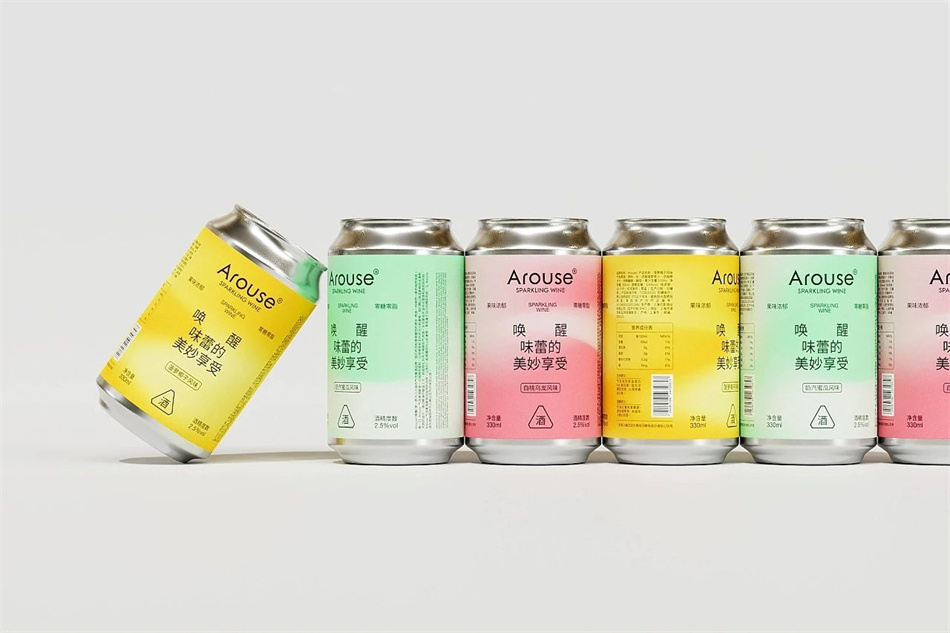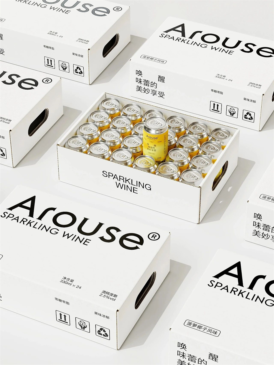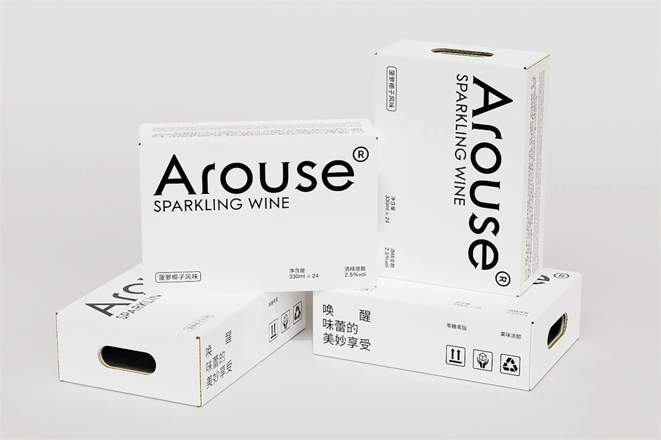 氣泡酒包裝設計版面布局則以簡潔的純文字編排為主,重點突出品牌名和slogan,讓顧客更直觀地感受到Arouse獨特的品牌魅力和時尚個性。