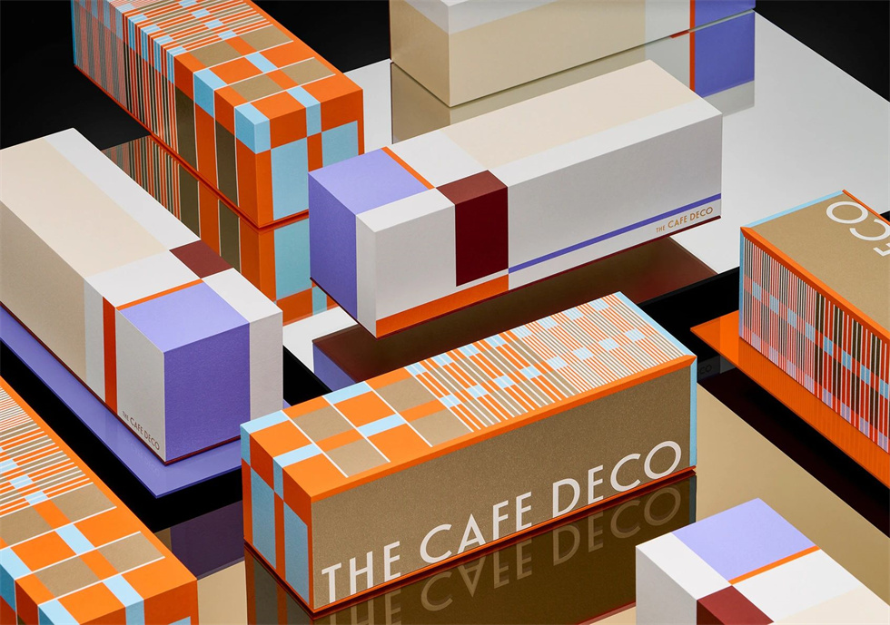 The Cafe Deco的精裝咖啡禮盒包裝設(shè)計(jì)有兩款,選用六種Pantone特色塊狀排列,克服印刷上的難度,將方格狀的幾何排列精準(zhǔn)對(duì)齊,使每個(gè)顏色不會(huì)交疊在一起,并在包裝成型上將誤差值壓到最低。