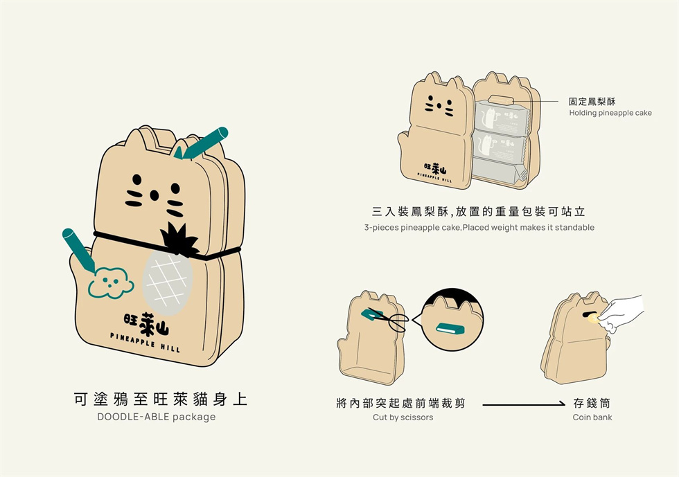嘉義民雄舊名打貓,以旺萊山吉祥物為鳳梨包裝設(shè)計造型,運用在本次的設(shè)計當(dāng)中,材質(zhì)選用了100%的再生紙漿與鳳梨纖維制成,創(chuàng)造出具有環(huán)保特色且趣味的包裝設(shè)計,內(nèi)部的固定結(jié)構(gòu)可以轉(zhuǎn)化成存錢筒的功能,并可以自由涂鴉創(chuàng)作,將循環(huán)設(shè)計的特性發(fā)揮到極致。嘉義是臺灣鳳梨品種的發(fā)源地,運用包裝設(shè)計全循環(huán)理念提升鳳梨附加價值,讓鳳梨產(chǎn)業(yè)更具愿景。從鳳梨酥碳足跡、鳳梨農(nóng)廢余料處里、設(shè)計及循環(huán)再生開發(fā),展示鳳梨全果應(yīng)用價值,希望能翻轉(zhuǎn)傳統(tǒng)水果食材,促進(jìn)鳳梨余廢循環(huán)經(jīng)濟(jì)新價值。旺萊喵鳳梨設(shè)計上以可持續(xù)性為核心,鳳梨纖維是一種天然、可再生的資源,其結(jié)合了纖維的強(qiáng)度和鳳梨的天然特性,融合創(chuàng)意與多功能性,打造獨特而令人驚艷的體驗,更是要通過功能和使用者體驗來提供價值,可愛的貓咪造型令人在視覺上有為之一亮的感覺。