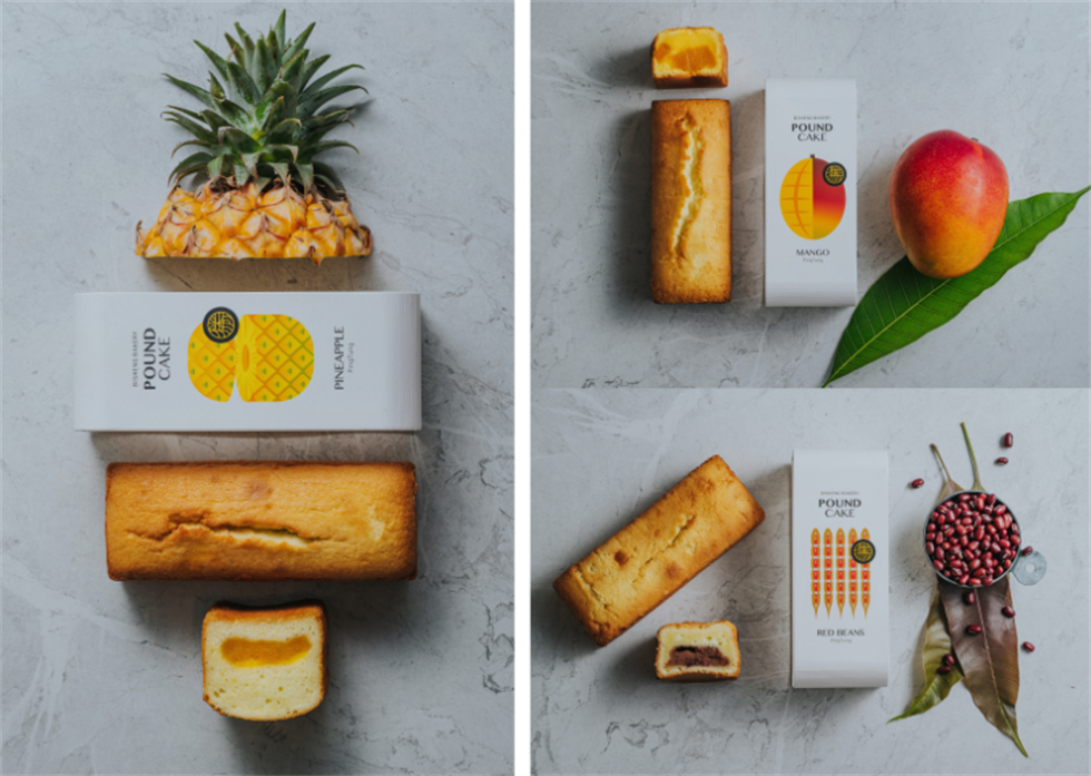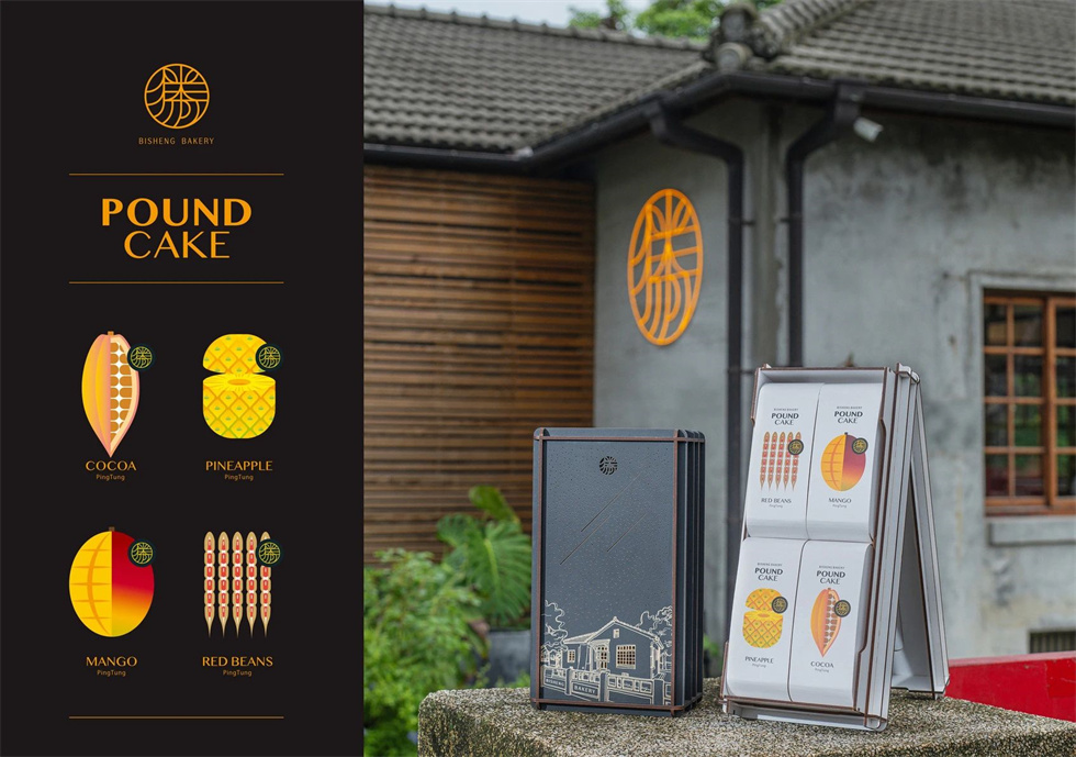 必勝烘焙制研所之磅蛋糕采用了屏東在地特色農(nóng)產(chǎn)品:鳳梨、紅豆、可可及芒果作為創(chuàng)新口味,除了推廣屏東農(nóng)特產(chǎn)之外,也為降低碳足跡盡一份心力。磅蛋糕包裝設(shè)計木盒之外觀視覺設(shè)計結(jié)合了店址所在地勝利星村的建筑特色,特殊的木盒結(jié)構(gòu)加入了傳統(tǒng)木建筑的力學(xué)概念,黑色木盒的特殊版本更加入了LED的星空來展現(xiàn)星光熠熠的效果。整個磅蛋糕包裝設(shè)計以四種農(nóng)產(chǎn)水果為表現(xiàn)主軸,以單純的插圖來呈現(xiàn)內(nèi)容物,讓消費者方便直觀購買。