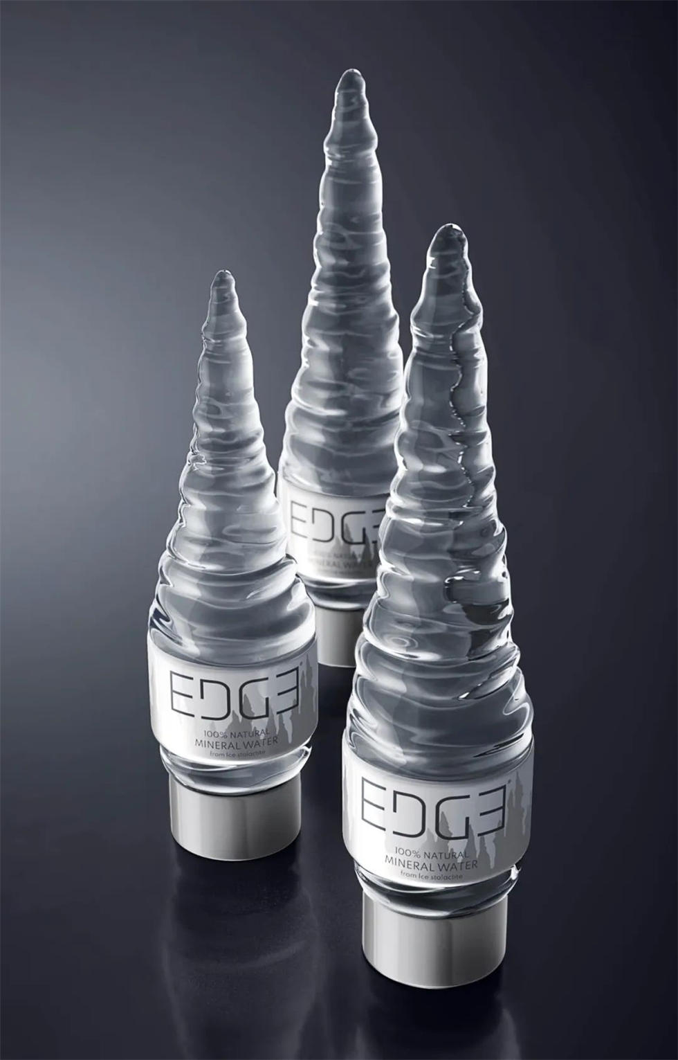 EDGE礦泉水包裝設計受洞穴中鐘乳石和石筍造型之美的啟發,“EDGE 礦泉水”通過瓶子的造型設計傳達了自然的工藝,與其他礦泉水品牌相比,這款產品在貨架上顯得更加與眾不同。