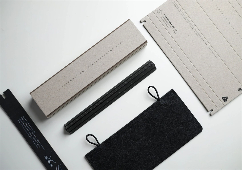 T3刻度尺包裝設(shè)計(jì)的主要材料是灰色和黑色的卡紙板,完全沒有使用任何包裝塑料。灰色和黑色這兩種顏色代表了建筑中廣泛使用的混凝土和金屬。由于比例尺多為建筑師使用,混凝土色調(diào)的包裝是我們產(chǎn)品的絕配。T3的尺子套是由羊毛氈織物制成。卡紙板與羊毛氈面料的搭配,為產(chǎn)品提供了極強(qiáng)的保護(hù),確保在運(yùn)輸過程中產(chǎn)品不易損傷。