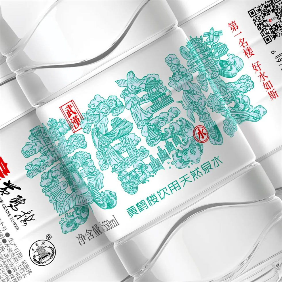 這是一款黃鶴樓出品的飲用天然泉水,設計師在飲用天然泉水包裝設計上用畫字的方式,打破了文字與圖形的界限,把武漢3500年文化融入到黃鶴樓三個字里,不斷強化品牌與城市文脈,瓶蓋圖案設計靈感來源于《白云黃鶴》中的駕鶴仙人,傳達出黃鶴樓的仙氣神韻。