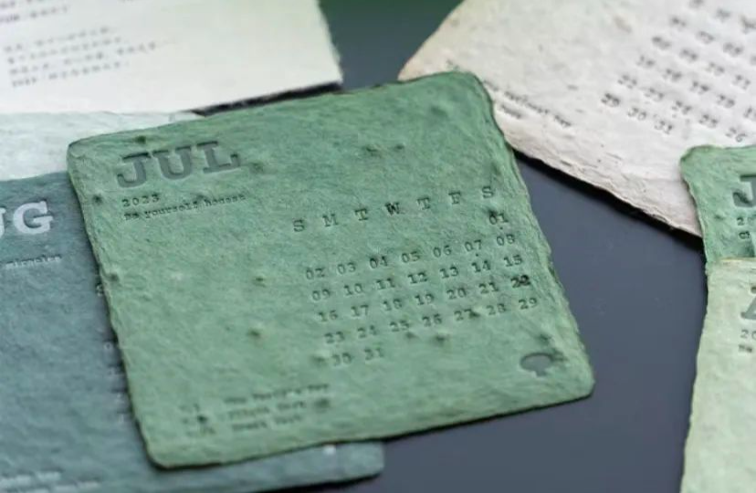 “咖啡渣變成紙,種子變成詩”,這是一款可以種植的日歷。一個月過完,在日歷紙上噴水,2—3天就會發出小芽。