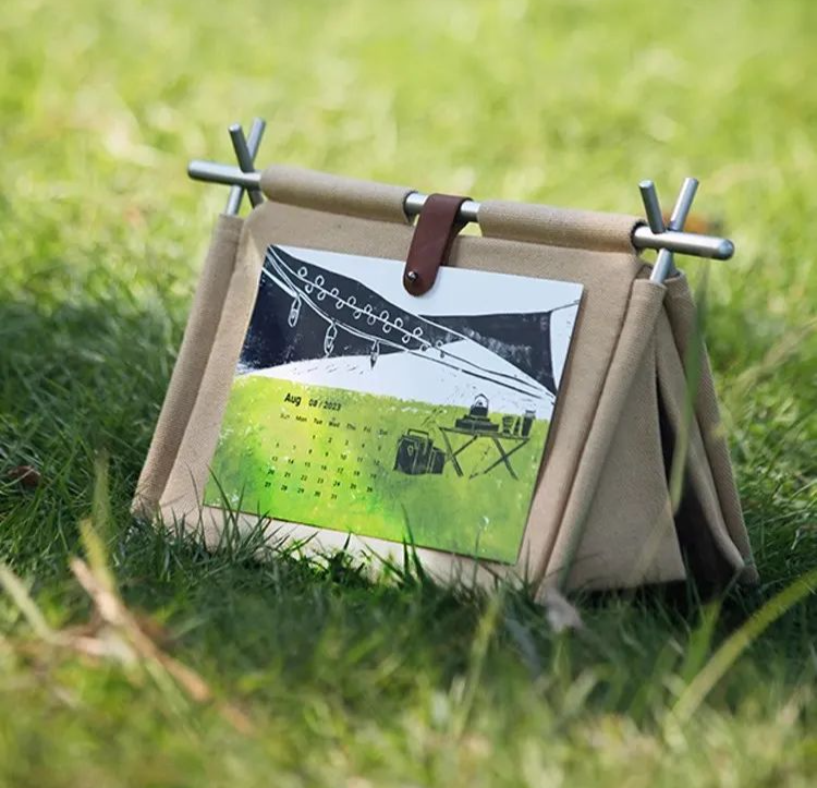 可以自己DIY,金屬支架撐起來就變成一個小帳篷。底部藏了個收納袋,平時可以放放筆、回形針、膠帶等桌面辦公小物件。12張戶外風景畫日歷設計,取用當月的,剩余月份可以收納在“小背袋”里。