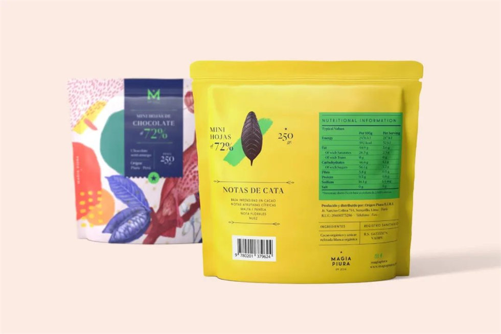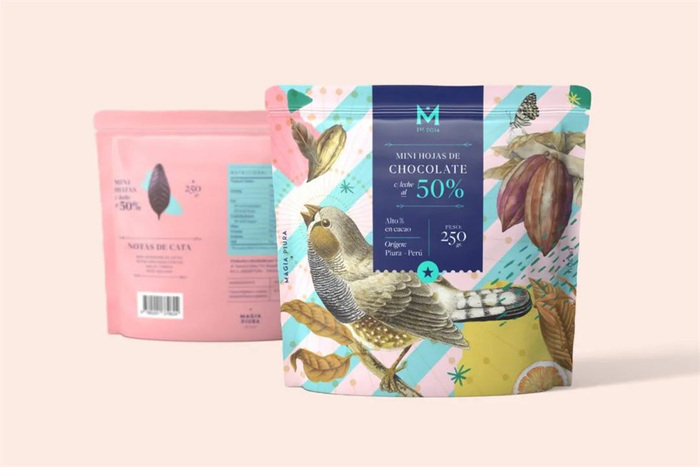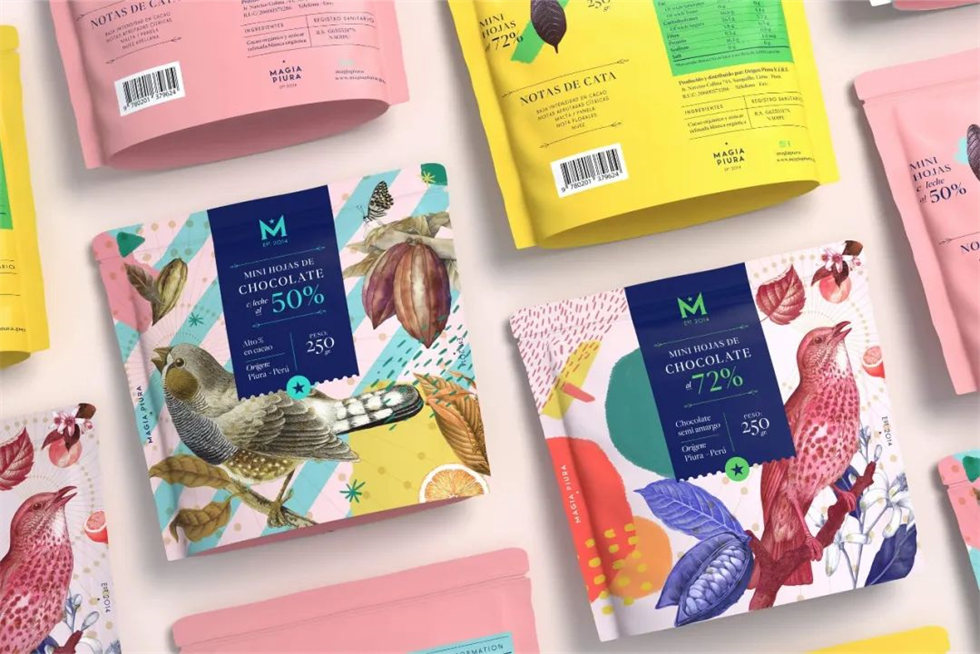 Magia Piura 已經以其獨特的葉形巧克力棒在市場上留下了自己的印記,小鳥、樹葉與水果圖案繪畫得精致細膩、文雅清秀。幾何和不對稱的形狀、慶祝當地生物多樣性的原色和強化神秘主義概念的圖形元素賦予了這種葉形巧克力包裝設計生命。牛奶巧克力迷你葉子采用粉色和藍色粉彩,而半苦迷你葉子則使用更大膽的包裝設計顏色。