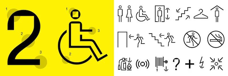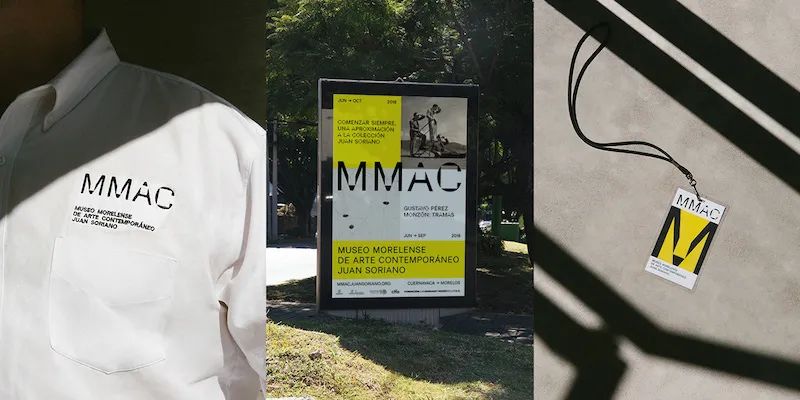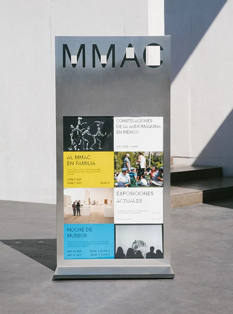 設計師通過添加方形切口設計了個性強烈的無襯線字體,其靈感來自Morelense當代藝術博物館建筑上具有特色的窗戶。Icon的設計也加入了方形切口,完善了圖形的細節。立式標牌的方形切口采用鏤空處理,展現了導視系統的特色。采用黃色和黑色作為博物館導視系統設計主色調,紅色、綠色和藍色作為輔助色,信息層級明確,整體視覺設計效果佳。