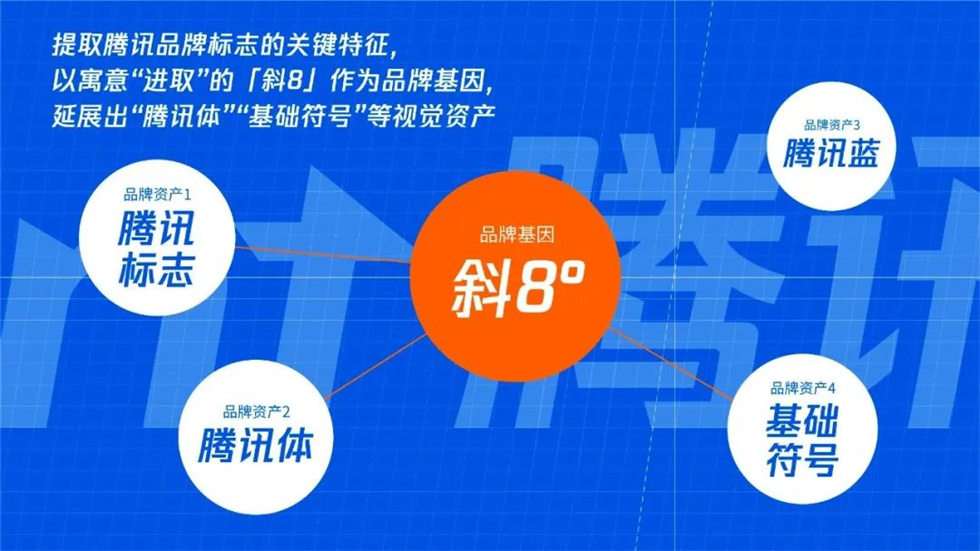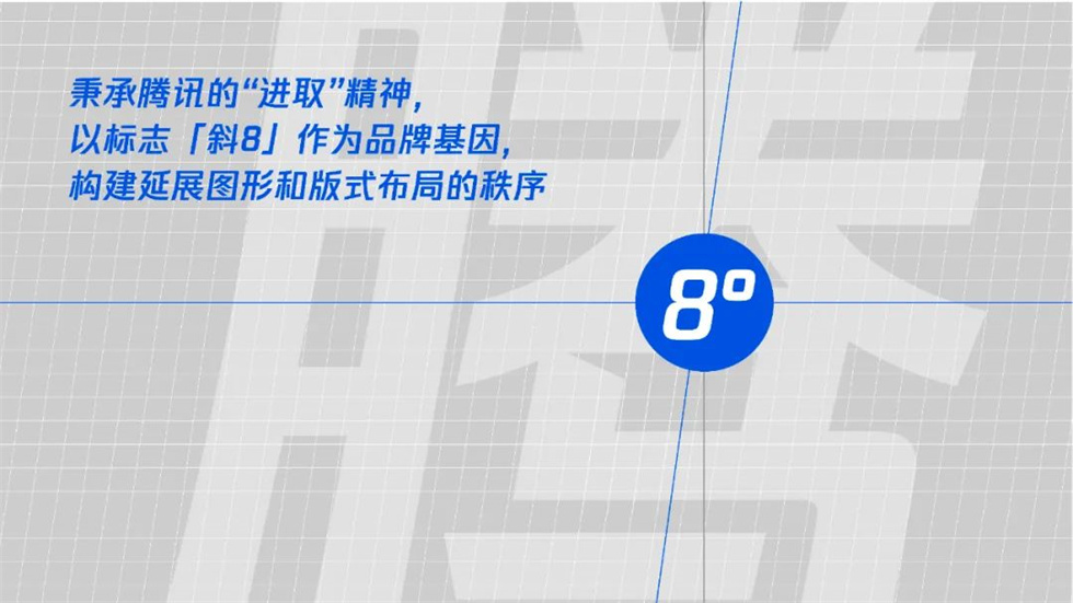為了應對日益繁多的品牌觸點,騰訊設計希望延續騰訊傾斜的“進取”精神,以標志「斜8」作為品牌基因,構建一套屬于騰訊品牌的輔助系統設計,以此強化品牌視覺識別設計體系。這樣自驅生長的好處是:可以保證各種品牌資產在各施所職的同時,也能保證一脈相承。