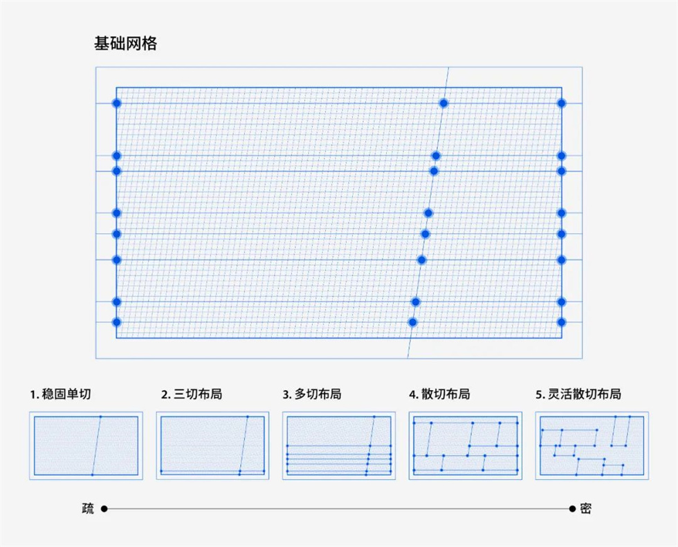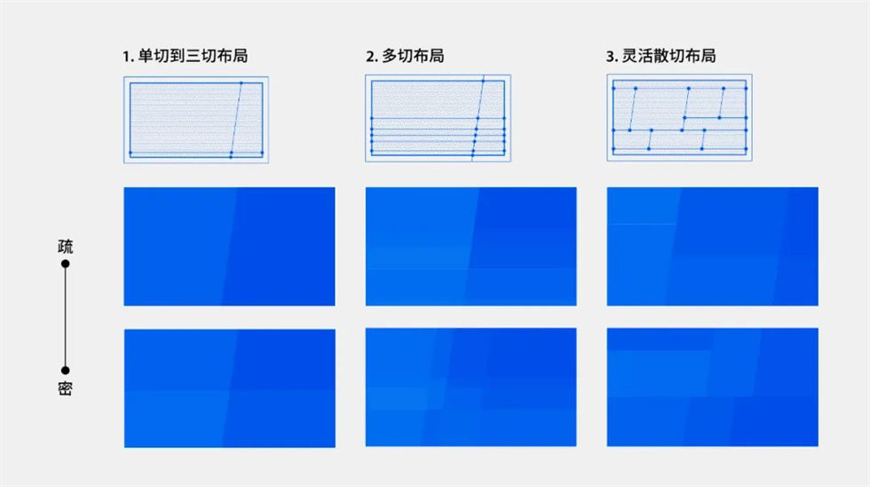 例:疏密關系。從疏到密的變化規則,對應著從單切到多切再到靈活散切的布局。以下圖為例,展示視覺變化規則。