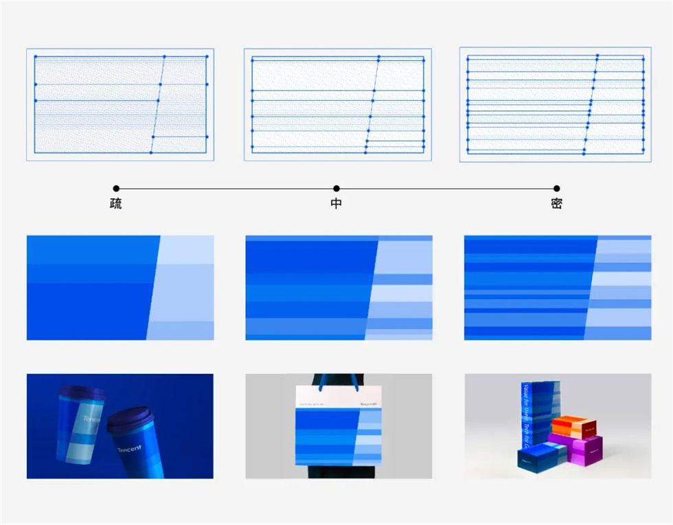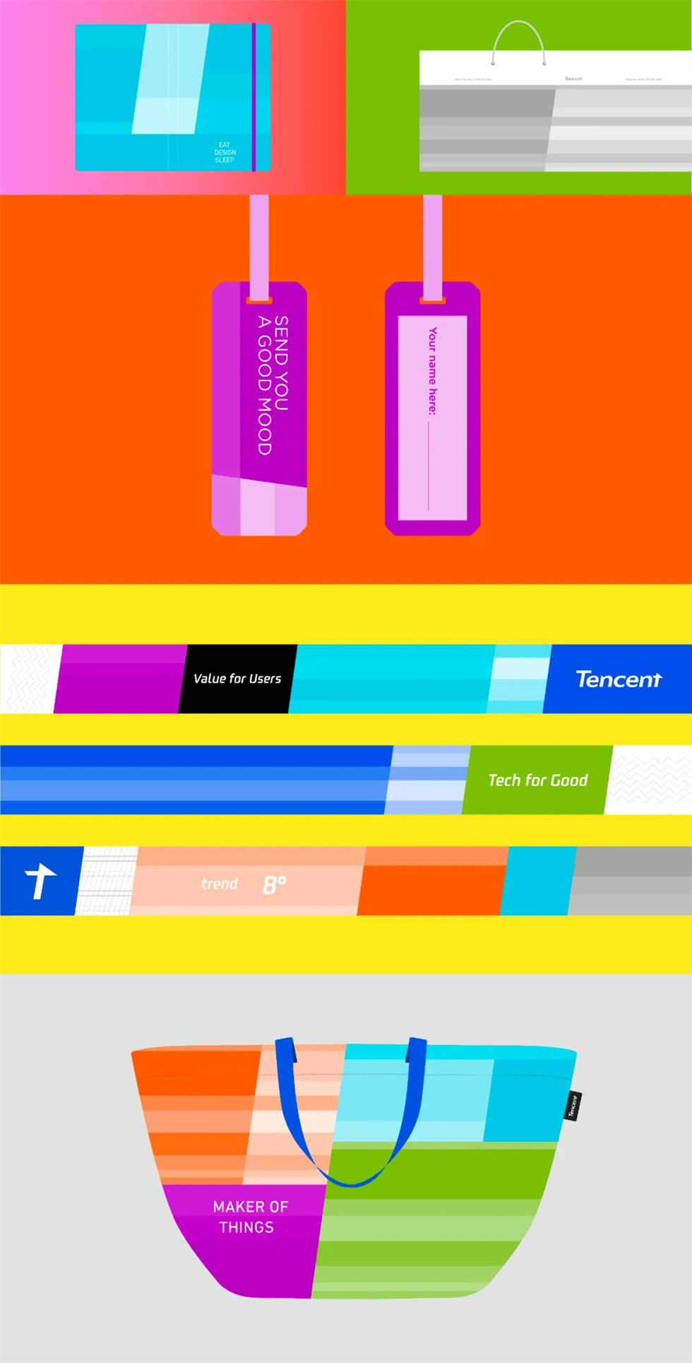 騰訊輔助系統秉承騰訊的“進取”精神,以標志“斜8”作為品牌基因,構建延展圖形的規則和版式布局的秩序。由“延展圖形”和“版式布局”兩部分組成。其中“延展圖形”主要是為了滿足品牌不同的應用場景,改變視覺呈現的單一和混亂感。“版式布局”則是為多場景的版式提供秩序感,強化騰訊品牌整體的視覺識別的體系。