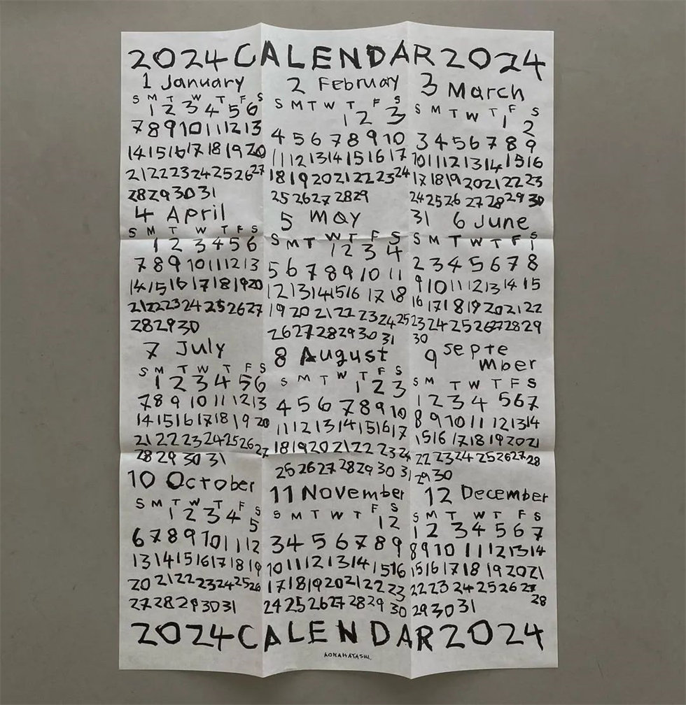 連續幾年,畫家、插畫師林青那(Aona Hayashi)都以隨性的手寫海報的形式繪制2024年歷設計。采用較薄的紙張,能夠輕易折疊、留痕。隨著時間流逝,紙張的褶皺就像是歲月留下來的痕跡。