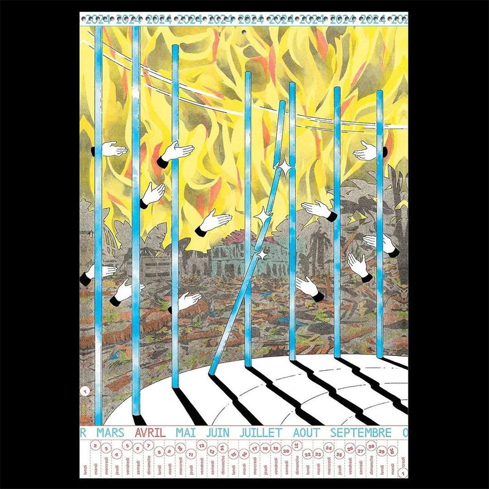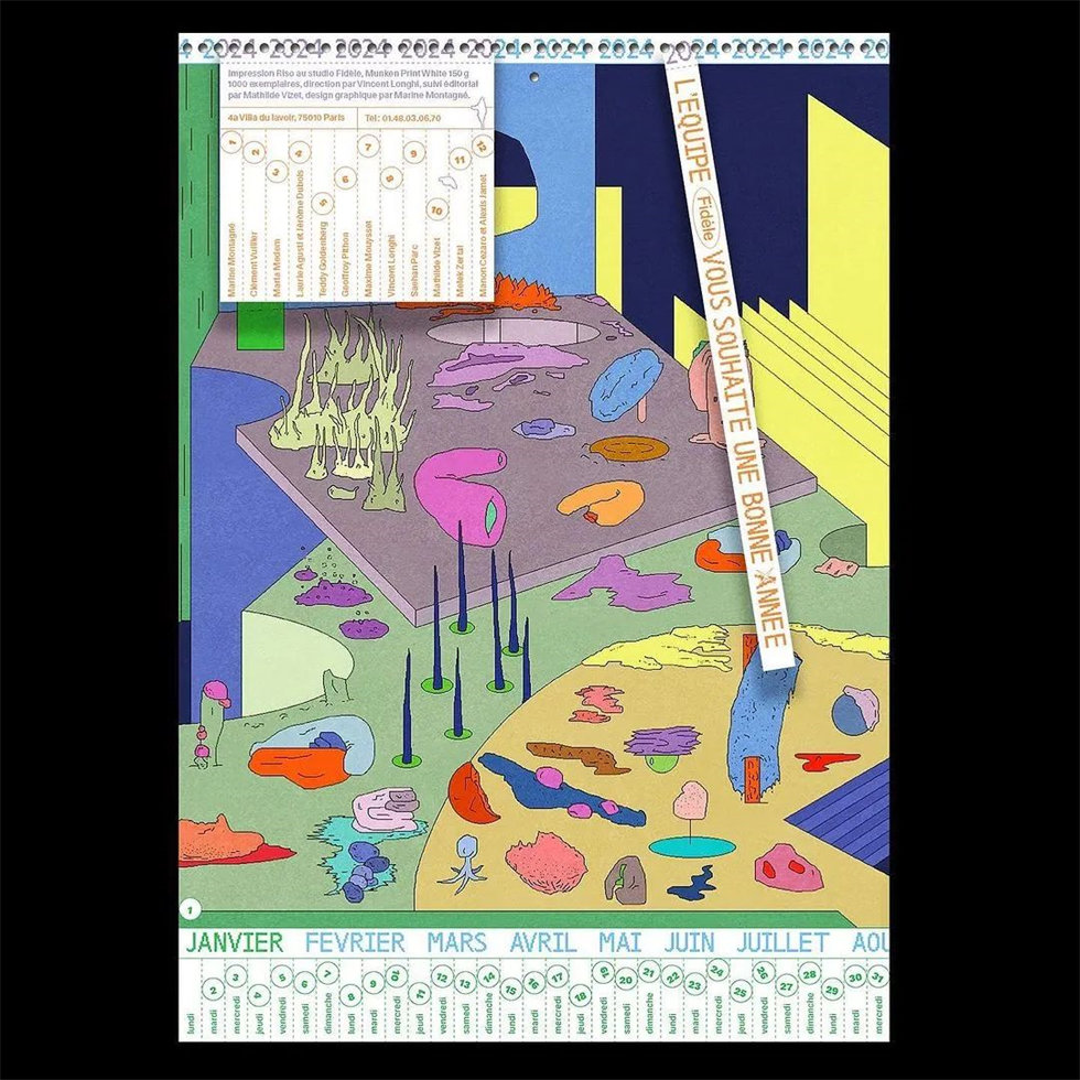 來自巴黎的Riso出版社、印刷工作室Fidèle向14位藝術(shù)家、插畫師發(fā)出創(chuàng)作邀請,并將他們的作品匯編為2024年年度日歷設(shè)計。這些藝術(shù)家包括:Alexis Jamet、Maxime Mouysset、Vincent Longhi、Saehan Parc、Mathilde Vizet、melek zertal、Manon Cezaro、Marine Montagne?、Clément Vuillier、Mari?a Medem、Laurie Agusti、Je?ro?me Dubois、teddy goldenberg、Geoffroy Pithon。
