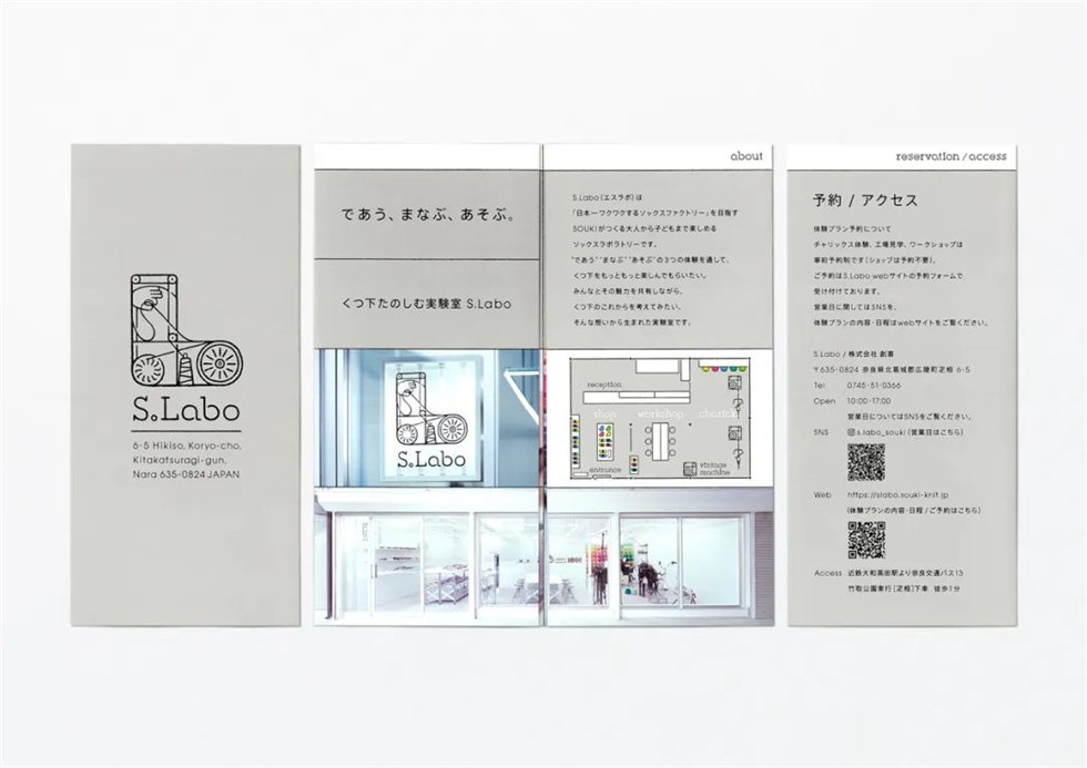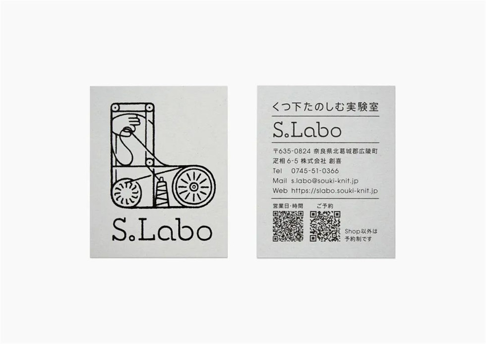 S.Labo是一個以實驗室為概念的商店兼工作坊,旨在享受襪子的樂趣。2021年,它由被稱為“襪子之鄉”的奈良縣廣陵町的一家老牌襪子工廠創建。這家商店的誕生是為了讓大家更加了解襪子的魅力,思考襪子的未來。同時,它也是一個能讓人們思索襪子行業可持續性的場所。設計師以此為品牌標志設計靈感,利用織襪機器和線作為主題設計圖形進行襪子工作坊的品牌形象設計。