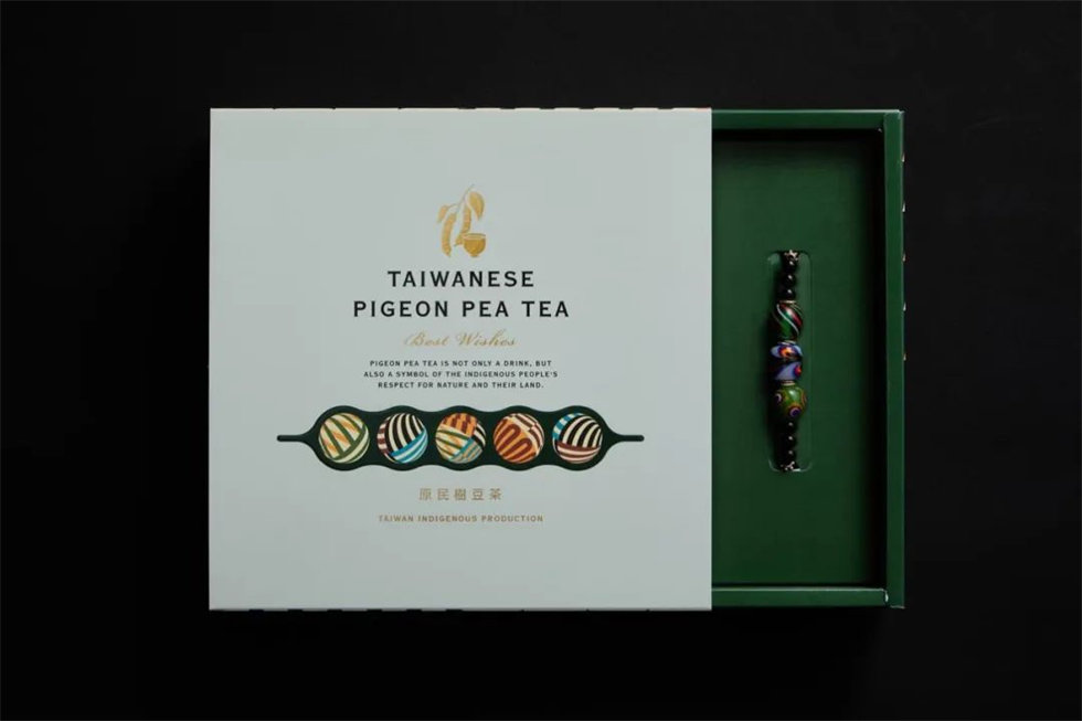在樹豆茶禮盒包裝設計上,以樹豆的豆莢圖樣為靈感,結合了琉璃珠古語qada所代表的美麗果實,以及號稱后山寶石的樹豆的意象,呈現出一種原鄉之美與自然的豐盈。琉璃珠則象征著排灣族文化中珍貴的獻禮,為禮盒增添了獨特的價值與魅力。