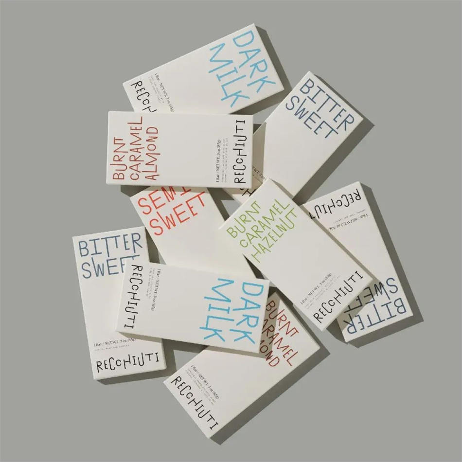 Manual為舊金山Recchiuti糖果店進行了品牌設計形象重塑。最突出的是交替排版的運行主題,就像精心設計的盒子里各種各樣的巧克力一樣充滿活力。有些字母看起來輕松而樸實,而其他字符的詞干和詞尾則伸出盒子。它給糖果包裝設計增添了一種生動活潑的感覺,當顧客看到里面真正的食物時,會有更多的驚喜。