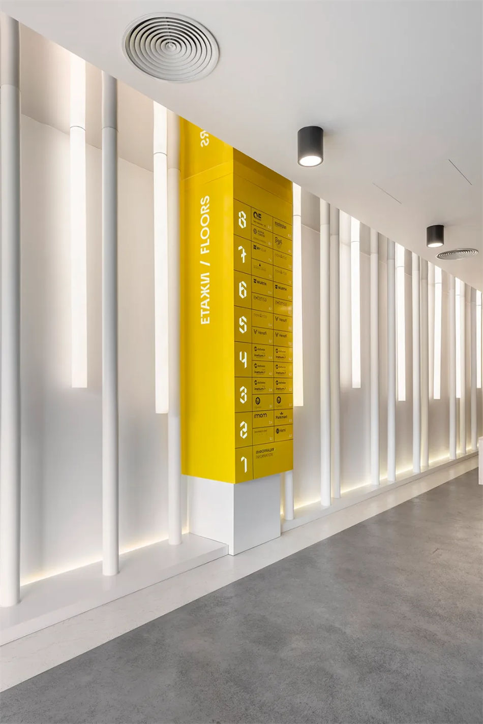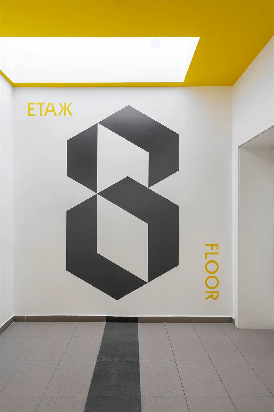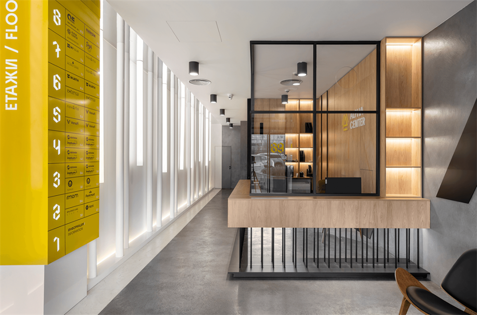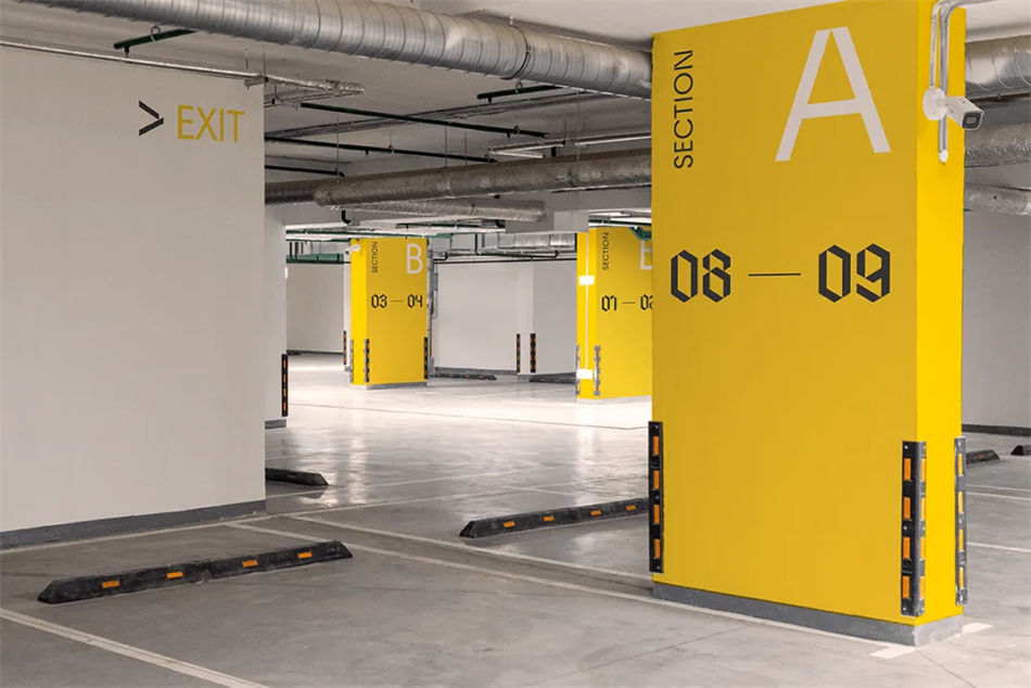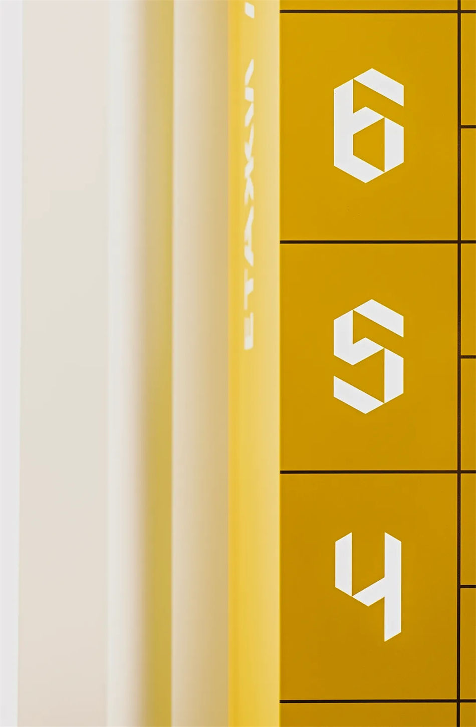 FourPlus工作室根據Alpha中心外觀的幾何形狀設計了一組自定義數字,以擴大整個物理空間的“獨特特征”。除了引導大廳的訪客之外,這些前衛的導視設計形式還成為標記每個樓層和引導地下停車場司機的主要圖形,形成了簡單而獨特的環境圖形,與建筑的室內空間設計相得益彰。