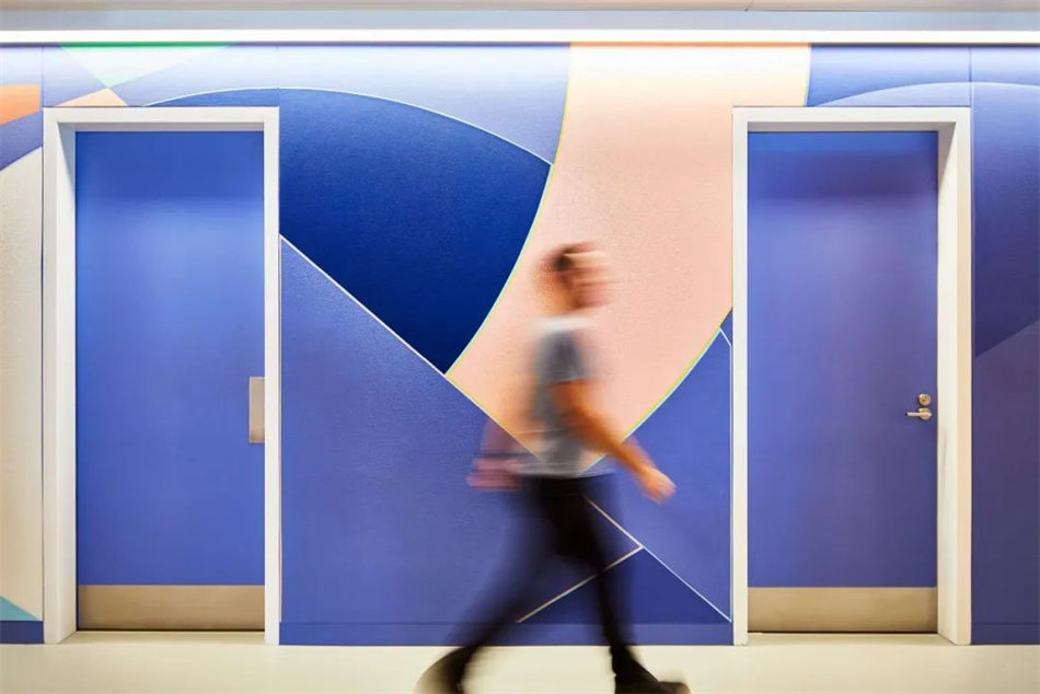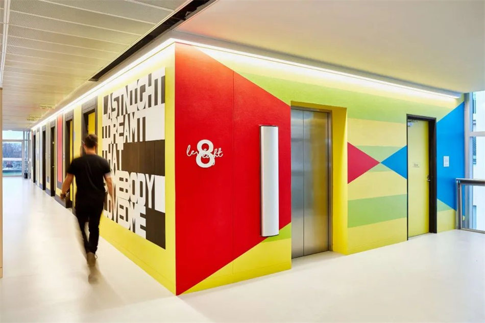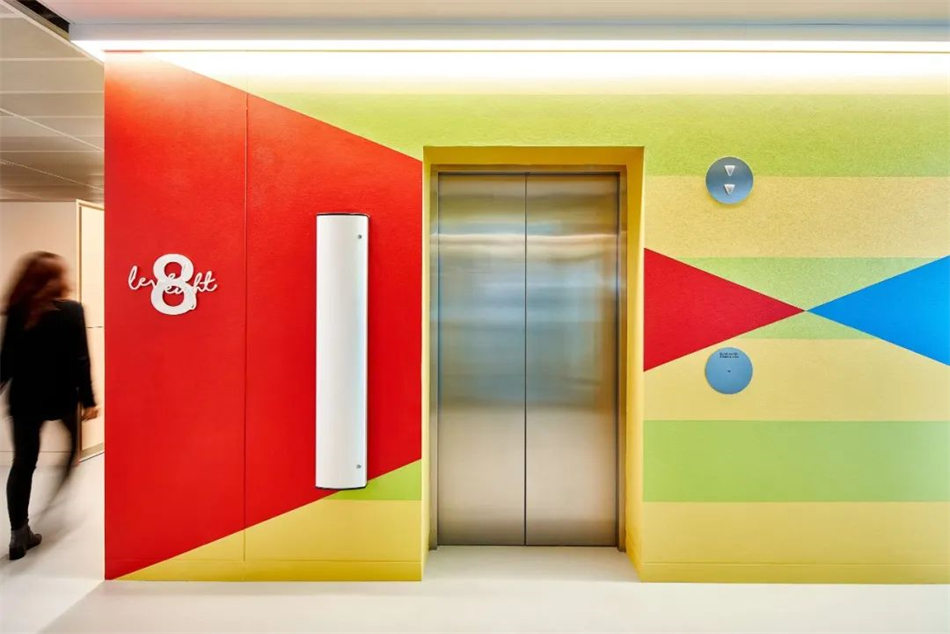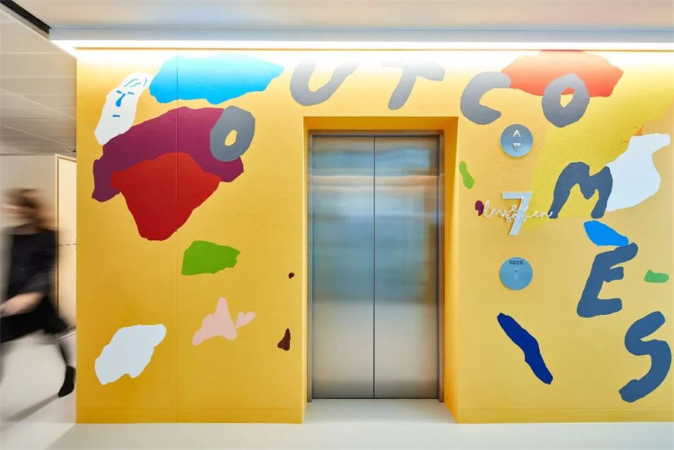 當(dāng)?shù)厮囆g(shù)家受委托制作現(xiàn)場(chǎng)藝術(shù)品——手繪每層的電梯核心。除了幫助員工定位外,這些獨(dú)特的藝術(shù)作品還將科學(xué)與更人性化的形式聯(lián)系起來(lái),成為公司創(chuàng)新科學(xué)研究與患者個(gè)人聯(lián)系之間的橋梁。