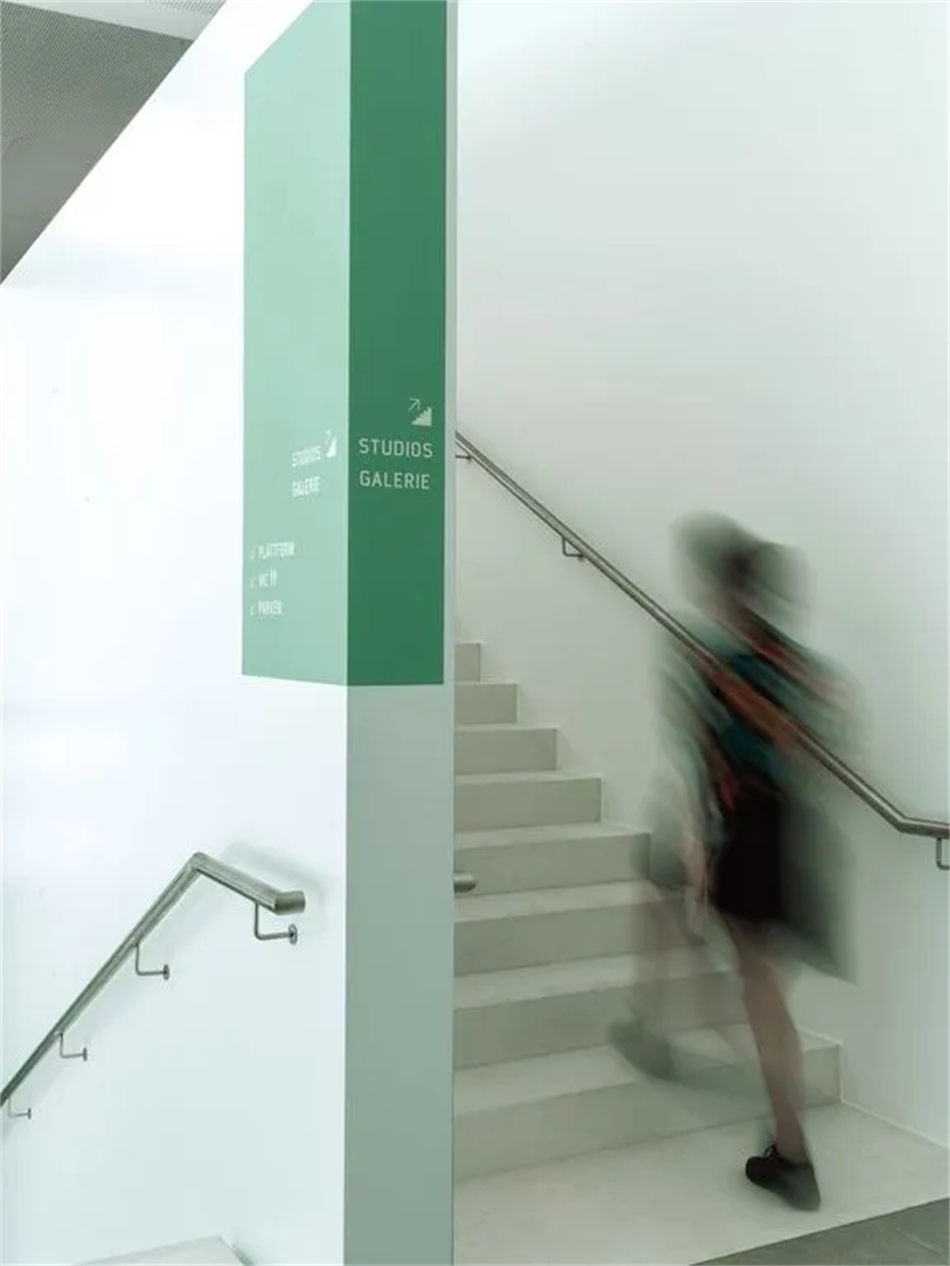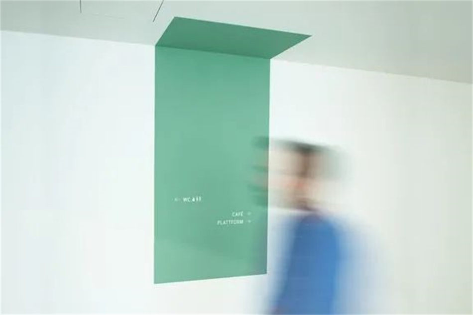 Schauwerk藝術(shù)館導(dǎo)視設(shè)計(jì)系統(tǒng)的顏色和形狀參考了建筑語(yǔ)言和室內(nèi)氛圍,使得標(biāo)牌的色彩和形狀很好地體現(xiàn)了空間氛圍,薄荷綠色路標(biāo)與空間形成對(duì)比,有助于提高信息傳達(dá)度。icon是基于建筑外觀定制的,具有現(xiàn)代化、藝術(shù)感等特征。標(biāo)識(shí)信息的彩色區(qū)域超越了角落和邊緣,通過(guò)空間延展來(lái)打破信息的一維性。